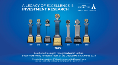 In addition, Asia Securities received the award as the Best Stockbroking Research Team at the CFA Society of Sri Lanka ‘Capital Market Awards 2025’, the country’s foremost capital markets awards.