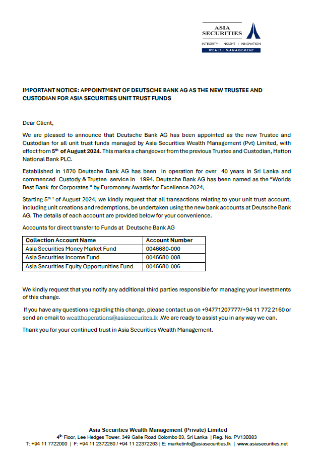 We are pleased to announce that Deutsche Bank AG has been appointed as the new Trustee and Custodian for all unit trust funds managed by Asia Securities Wealth Management (Pvt) Limited, with effect from 5th of August 2024. This marks a changeover from the previous Trustee and Custodian, Hatton National Bank PLC.