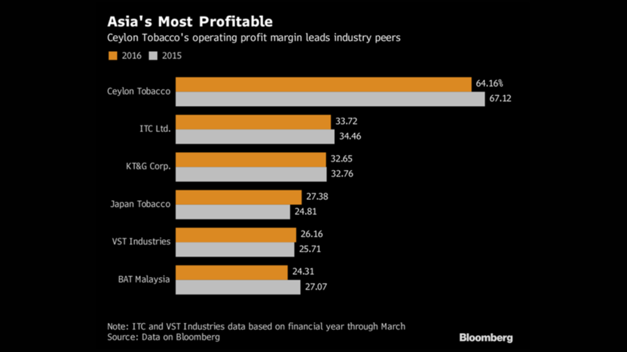 Ceylon Tobacco Co.’s profit margin will continue to narrow as an increase in levies on cigarettes prompts some smokers to switch to the cheaper alternative, said Emma Ridley, finance director of the Colombo-based BAT unit. The company’s operating profit margin, the highest among listed Asian peers, narrowed to 64 percent in 2016 from 67 percent a year earlier in a cigarette market estimated at about $1.1 billion.