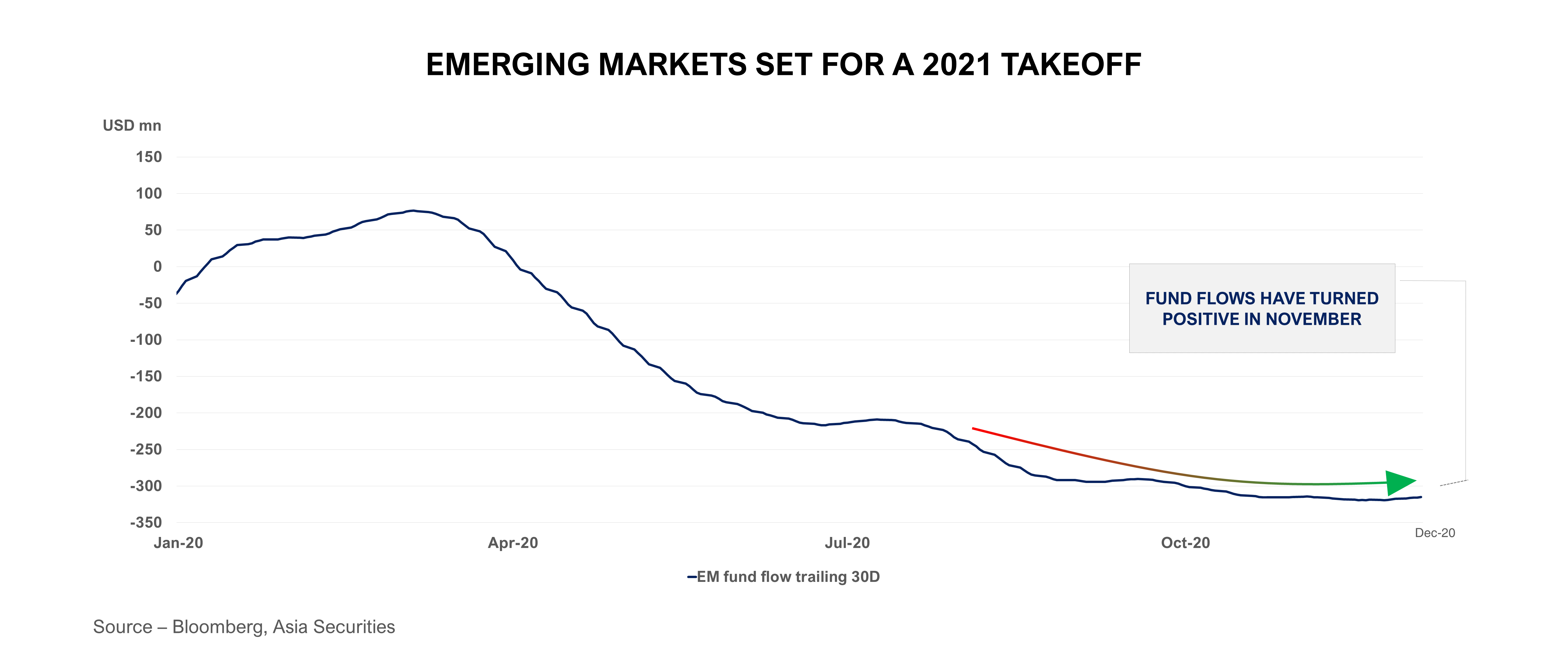 Asia Securities Research said that the momentum in equities from this point forth will also be dependent on how certain global factors playout. Emerging markets are expected to take off again in 2021, breaking a decade-long trend of asset allocations towards developed markets amidst superior growth, a strengthening USD, and strong yields. Several factors will drive this shift, including:
