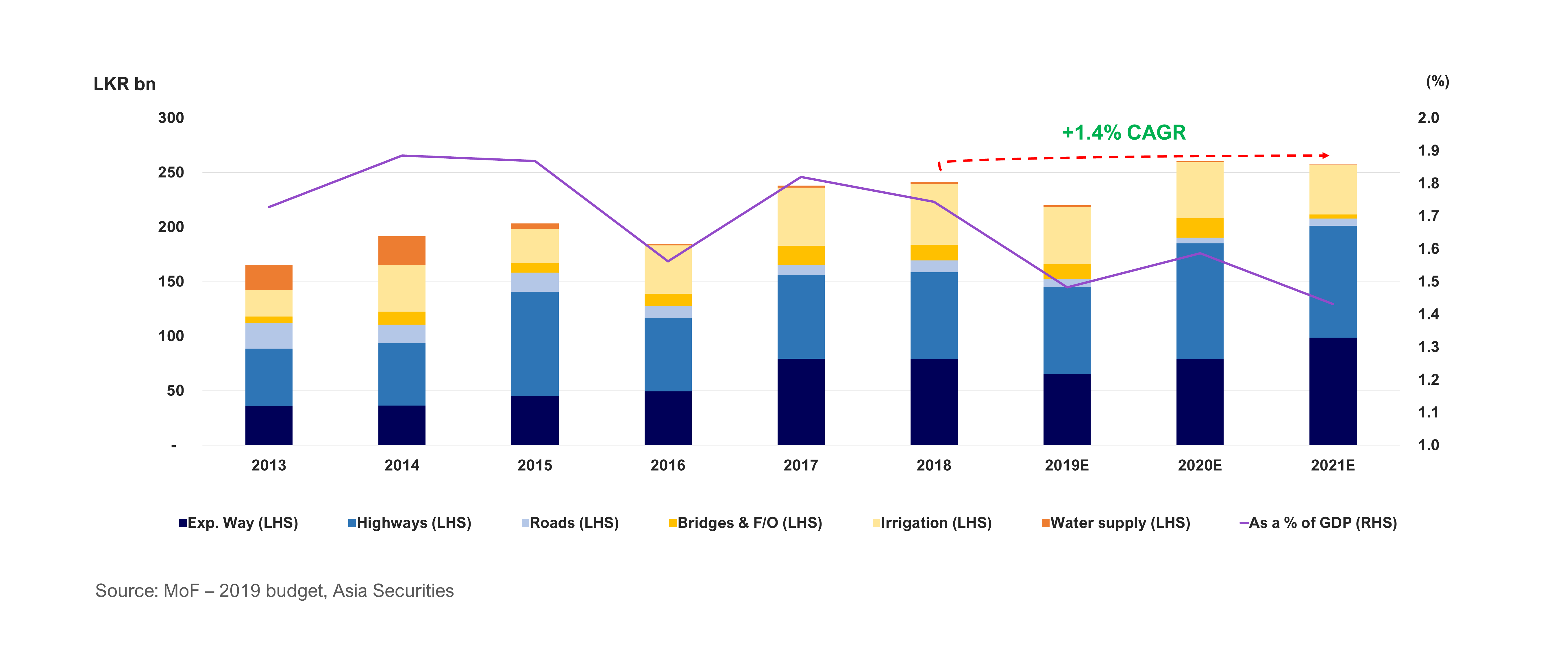 While infrastructure development will remain an integral part of Sri Lanka’s development agenda, Asia Securities does not foresee any sharp pick-ups in see near term activity. to the Government must tighten expenses to bridge the fiscal gap created by the recent tax cuts. However, 61% of total Government expenditure comes from state sector wages, Interest expenses and pensions, leaving limited headroom for any cuts. Infrastructure, in contrast, is a discretionary expenditure and, therefore, may seem some cutbacks.