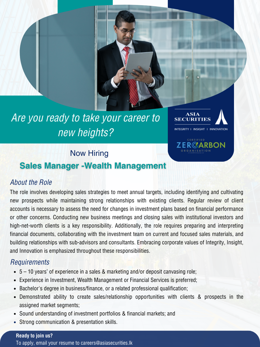 To apply, email your resume and cover letter to careers@asiasecurities.lk .